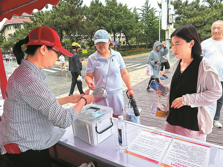 北戴河七桥浴场党员志愿服务岗志愿者为游客提供创口贴。通讯员苏娜摄