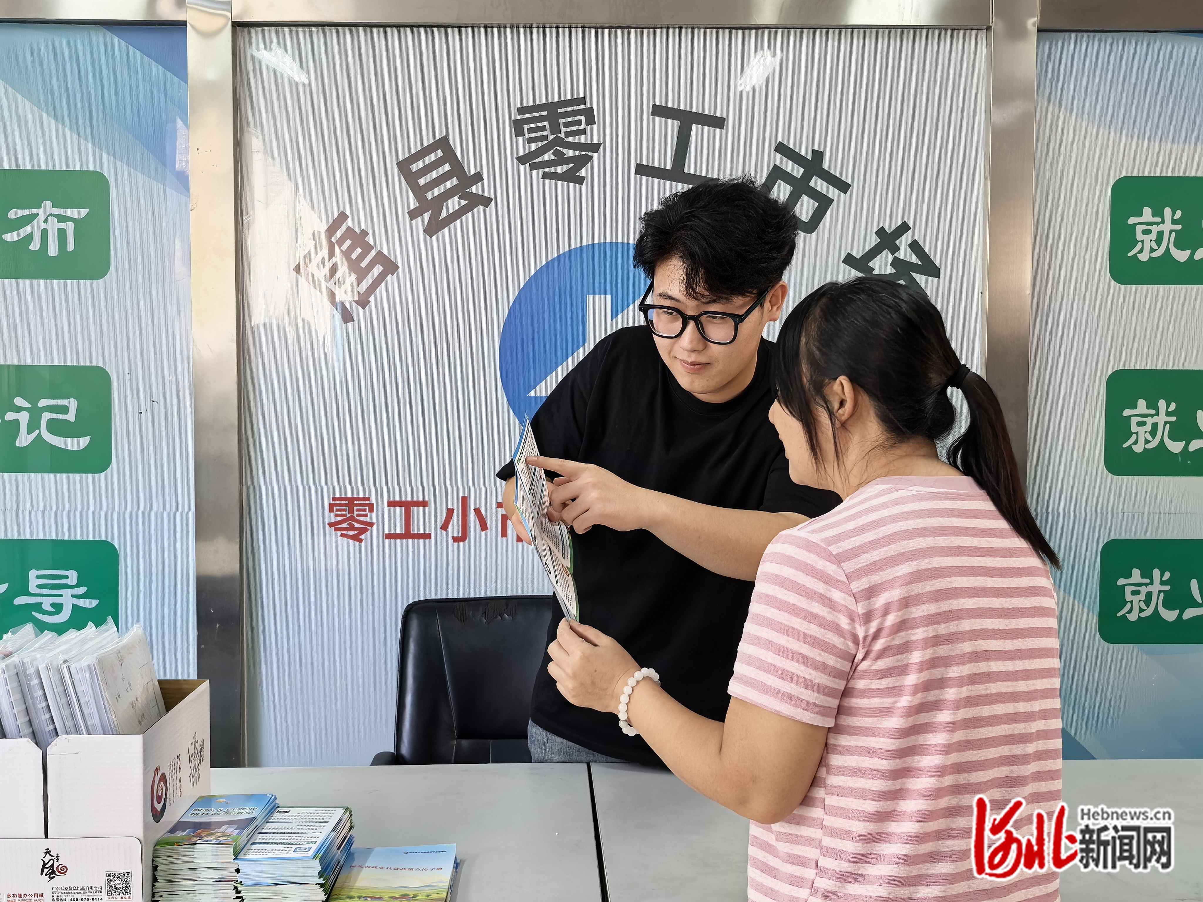 9月12日,唐县零工市场工作人员(左)为求职者详细介绍就业创业政策。 薛艺峰摄
