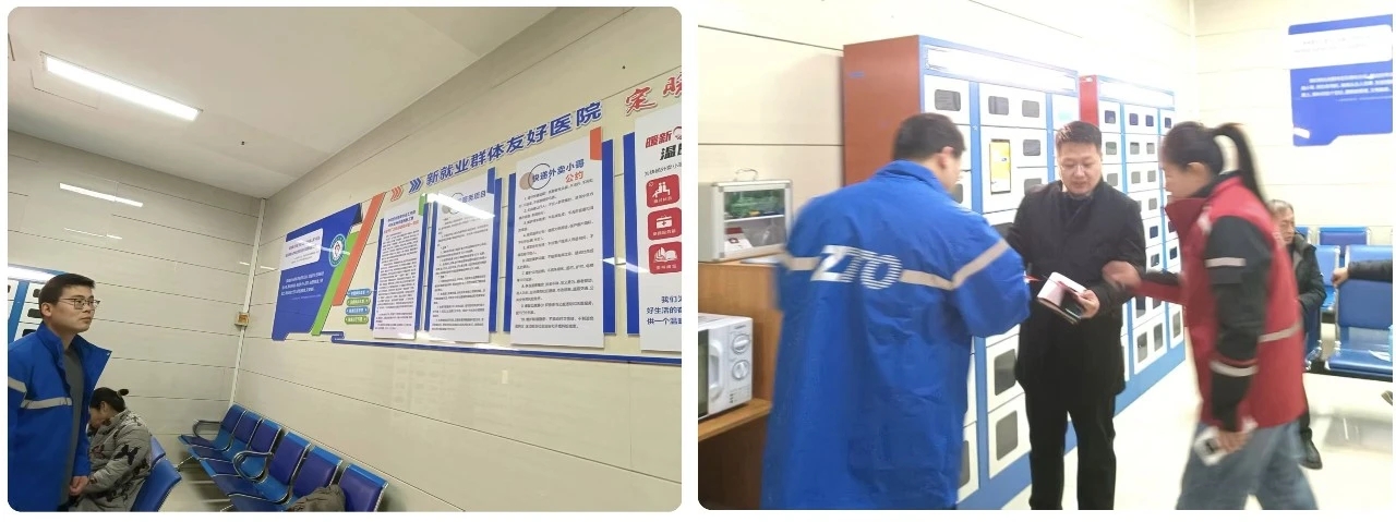 新就业群体友好医院聚焦新就业群体职业健康需求,整合现有医疗服务资源,突出“一专两站三优四免”,为新就业群体提供便利和健康服务。“一专”,即在人民医院入口显著位置设置专属停车位,为快递外卖小哥车辆停放提供便利。“两站”,即科学设置暖新驿站和外卖取餐站。暖新驿站配备微波炉、手机充电台、休息椅、饮水机、应急医疗箱和图书等,为新就业群体提供暖心的歇脚地、加油站;外卖取餐站设置外卖取餐柜,医护及患者顾客自主扫码取餐,节省外卖骑手送餐时间。“三优”,即深度体检优惠、心理咨询优惠,以及在参与医院基层治理中涌现出的好人好事给予优待。“四免”,即体检报告免费解读,帮助新就业群体更加直观了解自身身体情况;免费建立健康档案,动态跟踪健康状况,提供个性化健康管理建议和专家就诊推荐;免费健康义诊,提供个性化身体健康咨询指导;免费健康知识科普,增强常见疾病认知和预防意识,培养良好的生活习惯和健康工作方式。