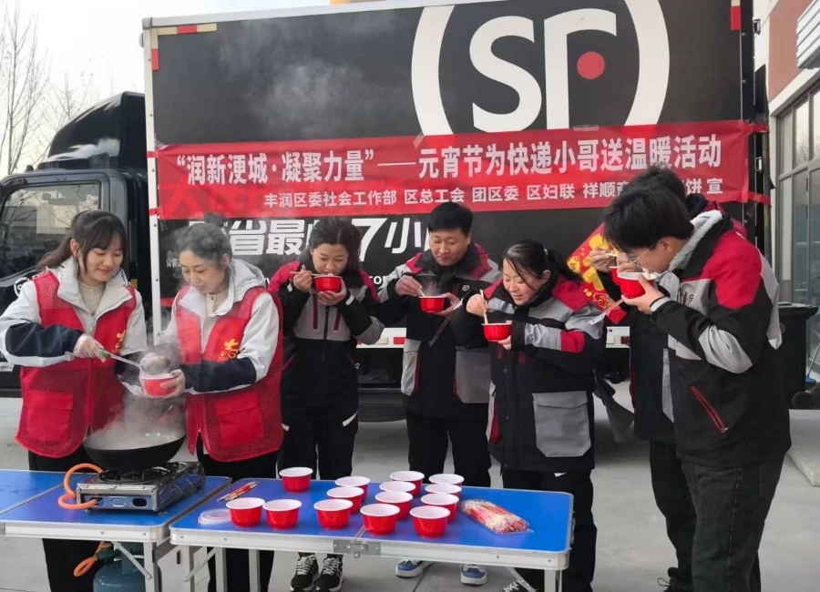 “万家灯火元宵闹,一碗汤圆瑞气盈”。适逢元宵佳节,唐山丰润区委社会工作部以2月份“快递小哥服务月”为契机,牵头区总工会、团区委、区妇联、祥顺斋棋子烧饼老字号及志愿者们到顺丰速递、圆通速递等站点,为寒冬中穿梭街巷的“丰行侠”送上节日的特别“快递”。