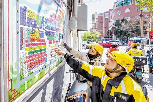 4月6日,邯郸市邯山区罗城头社区,外卖骑手对照道路通达指引图确认配送路线。河北日报记者 田明摄