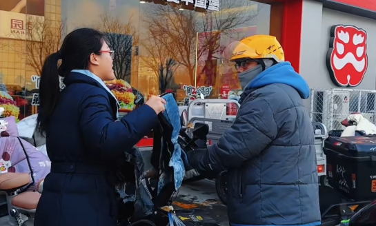 工作人员把爱心人士购买的护膝送到外卖小哥手上