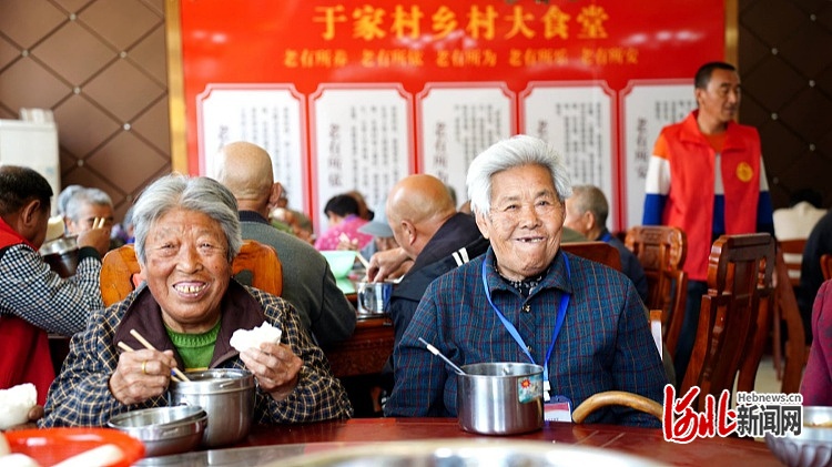 图为井陉县于家乡于家村乡村大食堂开业,老人围坐一起共品热腾腾的饭菜。