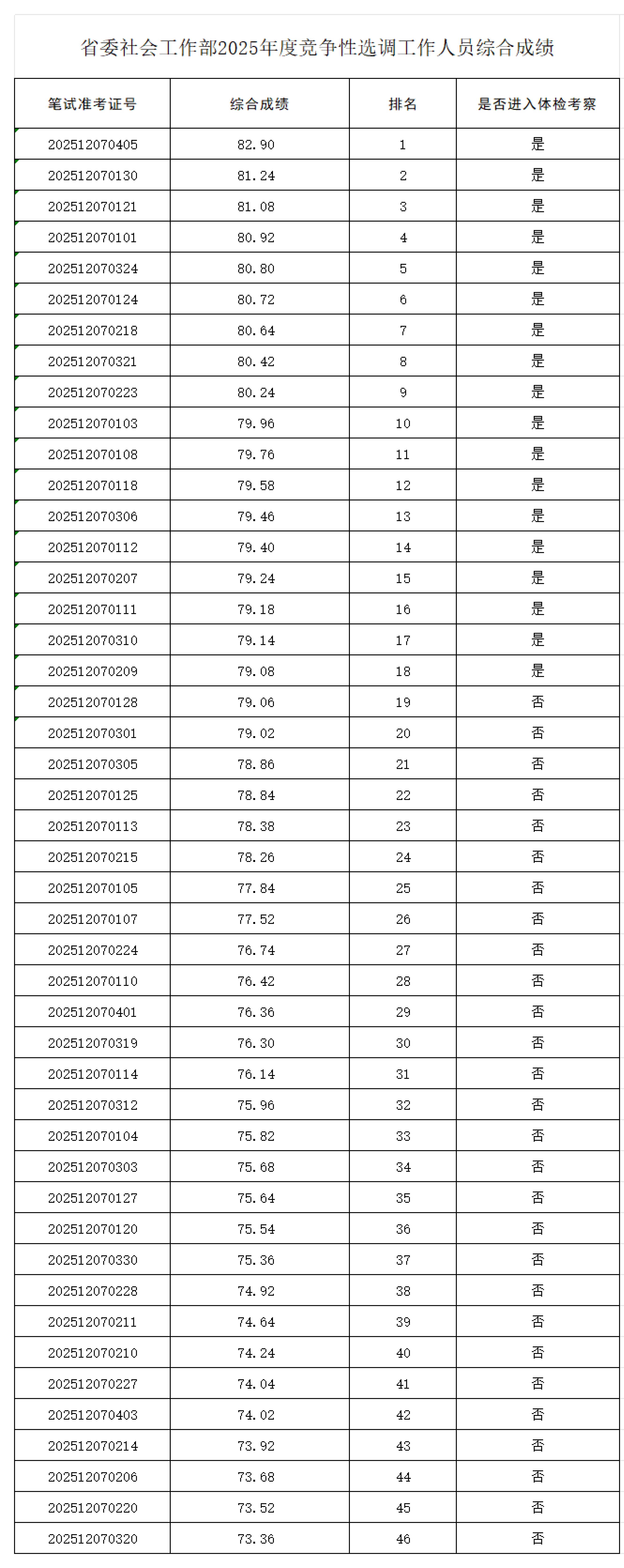 省委社会工作部2025年度公开遴选公务员综合成绩及进入体检考察人选详见附件。